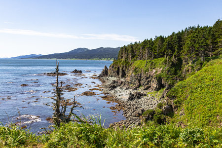 Cape Giant. Bizarre rocks. Okhotsk Sea coast. Sakhalin, Russia