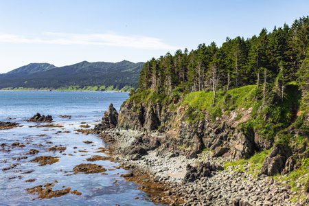 Coastal view of rocky shore and lush green hills under a bright blue sky in early summer