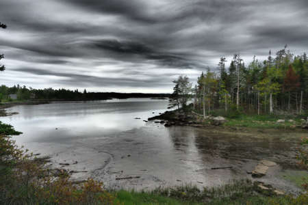 A lake and a cloudy dark sky over it in Canada