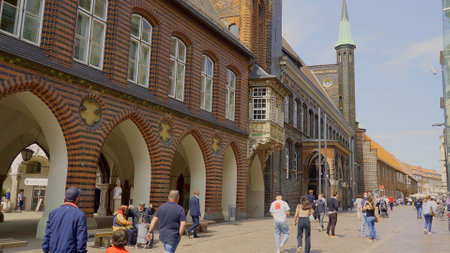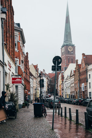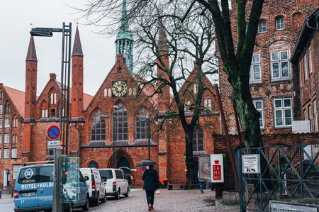 Lubeck, Germany - February 13, 2024: Lubeck city centre in region Schleswig-Holstein, Germany. Hanseatic City. Old Town architecture.