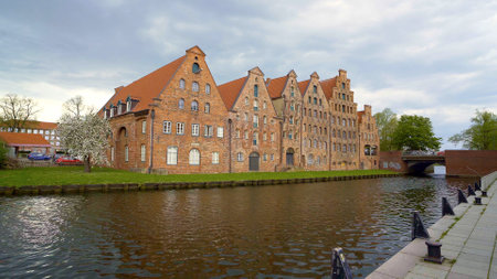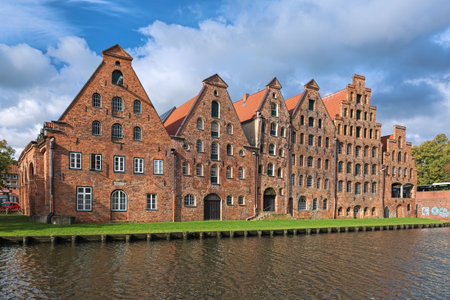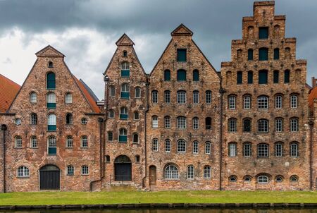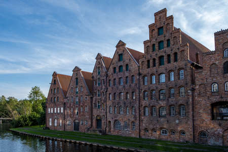 Group of historic salt warehouses along the Trave River in Lubeck, Germany