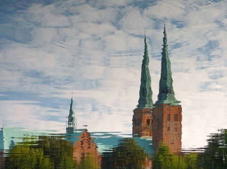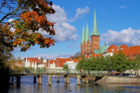 Waterside scenery around Luebeck Cathedral in Luebeck, a hanseatic city in Northern Germany