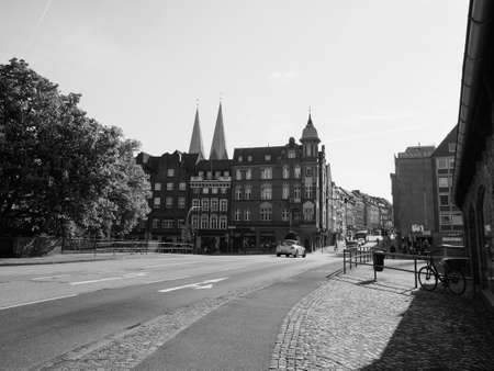 LUEBECK, GERMANY - CIRCA MAY 2017: View of the city from Holstenbrucke in black and white