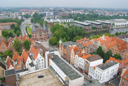 Lubeck, Germany - July 18, 2008 : Aerial view to the old city and Holstentor city gate in Lubeck, Germany.