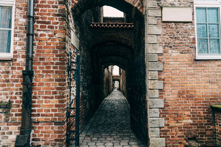 Scenic view old narrow european german Lubeck town with red brick ancient houses vintage iron stained glass lamp lantern on wall. Cityscape heritage city altstatd in Germany travel destination
