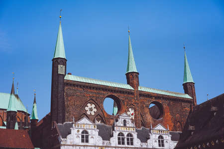 LUEBECK, GERMANY - April 29 2018: The historic town hall in Town Hall square, Luebeck