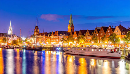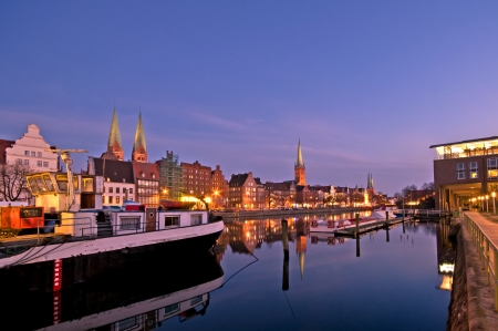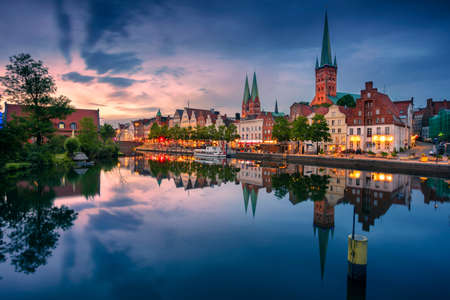 Lubeck, Germany. Cityscape image of riverside Lubeck with reflection of the city in Trave River at sunset.