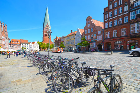 Lueneburg, Germany - June 5, 2018: View to the German medieval town of Lueneburg. You see the facades of bricks and small shops and a lot of bikes in a row.