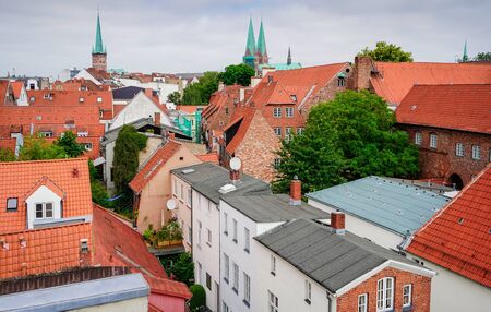 aerial view of tiled roofs of ancient town Lubeck, Germany