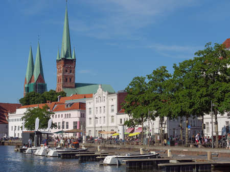 Historic old town of luebeck at the pier of the river trave, tourism attraction with brick architecture, churches and cathedrals and the urban street life, Europe, North Germany