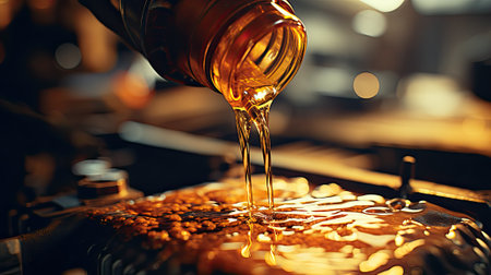Beautiful close-up of engine oil flowing in warm sunset light, capturing the rich amber color and reflective qualities of the liquid for automotive themes.