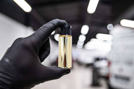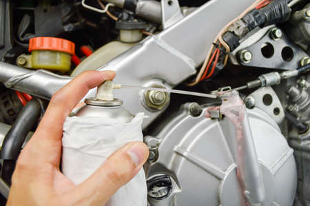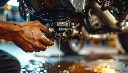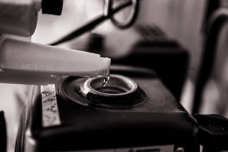 Close-up of a hand of a mechanic pouring oil on a motorcycle