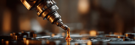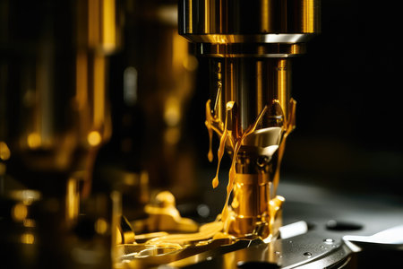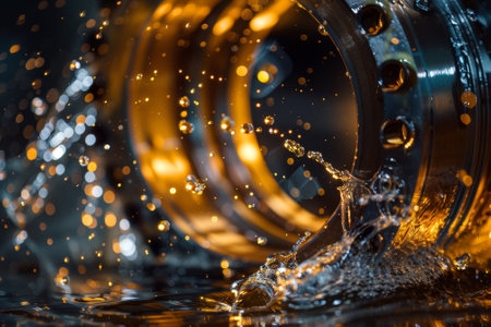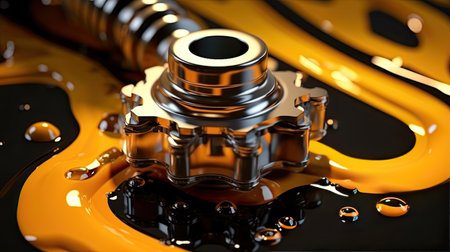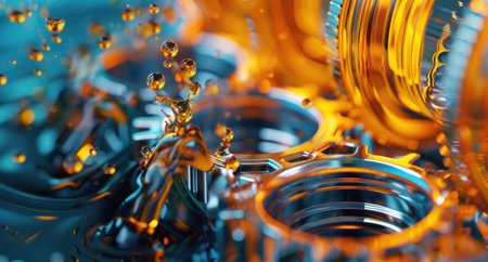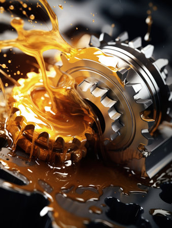 Golden oil splashes from an engine, showcasing the artistry of moving machinery with shiny gears.