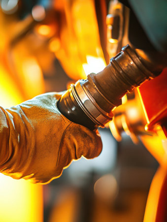 Gloved hands firmly grasp a fuel nozzle, showcasing a vibrant yellow and red color scheme. The dramatic lighting highlights the industrial context of fueling.