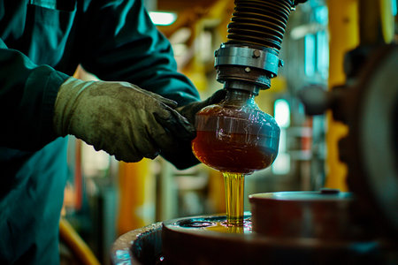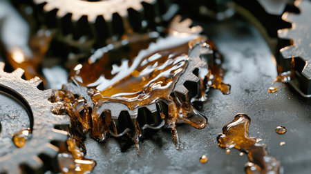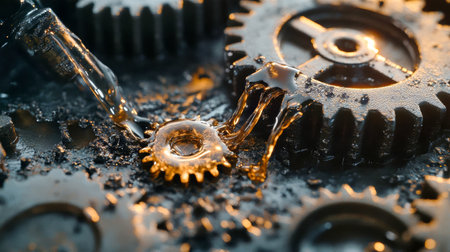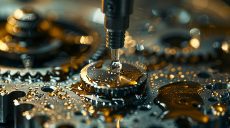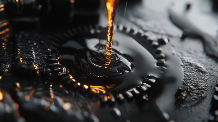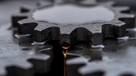 This stunning close-up image showcases oil being poured onto intricate gears, highlighting rich textures and reflective surfaces in an industrial environment.