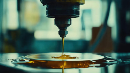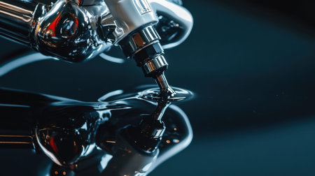 A metallic nozzle is carefully dispensing a droplet of fluid onto a surface, showing intricate details in a workshop filled with tools.