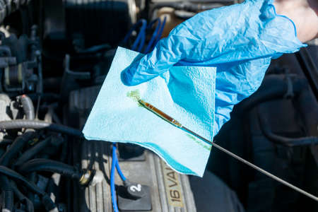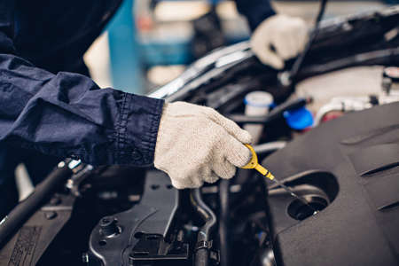 Home service car concept : A man check level of engine oil and see the stains from use basic maintenance of car