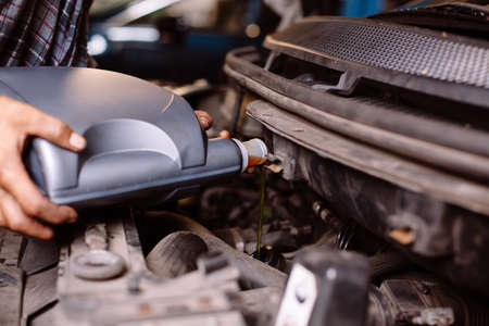 Car mechanic pouring motor oil into engine a close up on vehicle maintenance and repair service