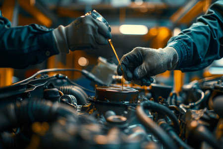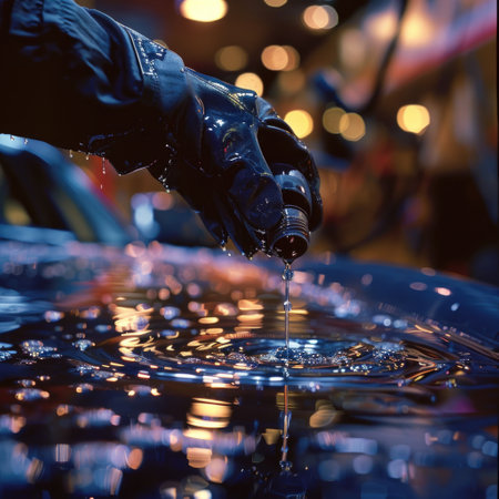 Close-up view of engine oil being poured into an engine component, highlighting the importance of fluid maintenance in automotive performance and care.