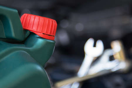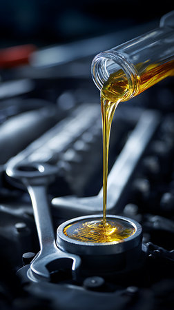 Motor oil flows from a bottle into a car engine. An open end wrench lies nearby. Other car engine parts are blurred in the background, moody lighting.
