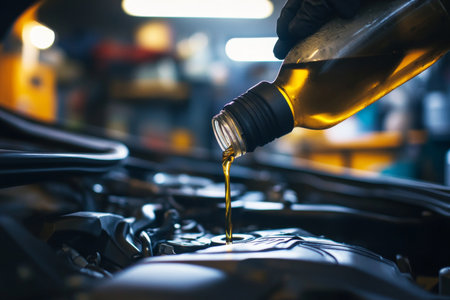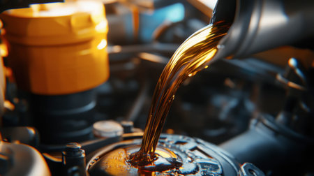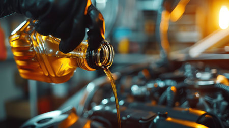 A bottle pours engine oil onto a vehicles engine, highlighting the maintenance activity necessary for proper vehicle function. The process occurs over a white backdrop, emphasizing cleanliness.