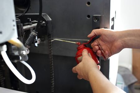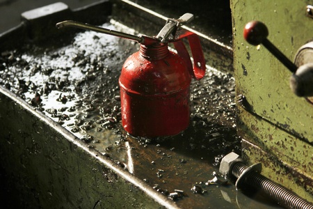 Close-up macro image of a lathe machine being used to apply industrial lubricants