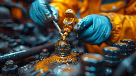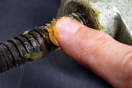 Macro shot of industrial grease being squeezed out of a tube onto a mechanical component