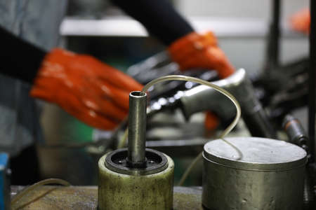 Auto mechanic working in auto repair service. Close-up of male hands in gloves repairing an engine.