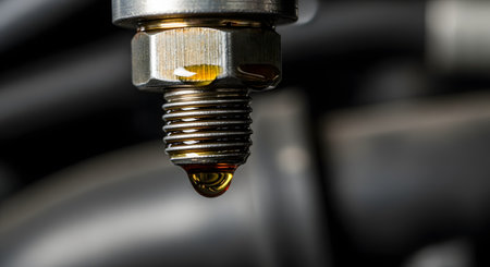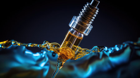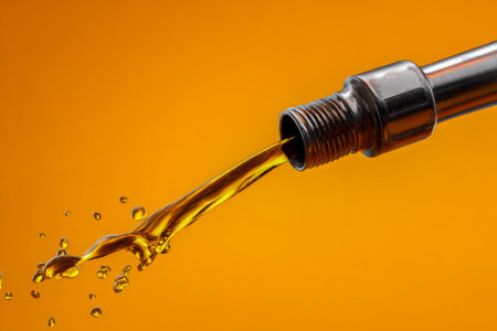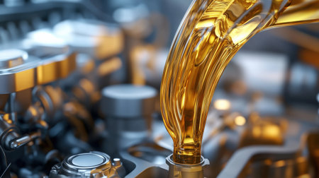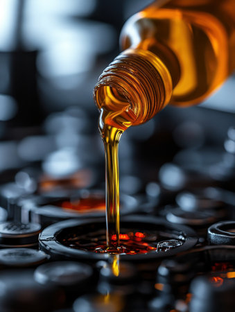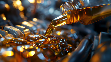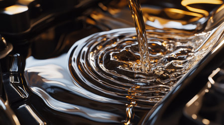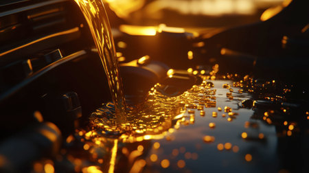 Beautiful close-up of engine oil flowing in warm sunset light, capturing the rich amber color and reflective qualities of the liquid for automotive themes.