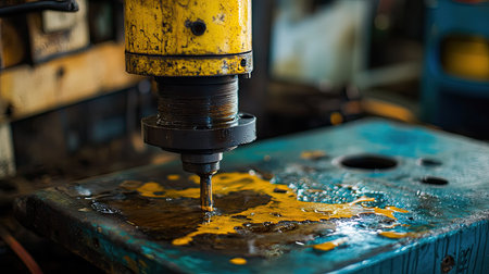 Close-up view of an oil spill on a factory floor, showcasing the dripping from a nozzle as it highlights maintenance and safety concerns in an industrial workspace.