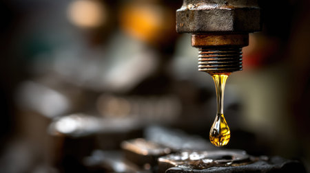 This close-up image showcases a single drop of oil dripping from a metal fitting, highlighting the detailed texture and shine of industrial machinery.