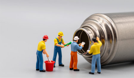Tiny figures come together to clean a large stainless steel thermos. They hold tools and buckets, showcasing teamwork and fun. The scene is vibrant, colorful, and inventive.