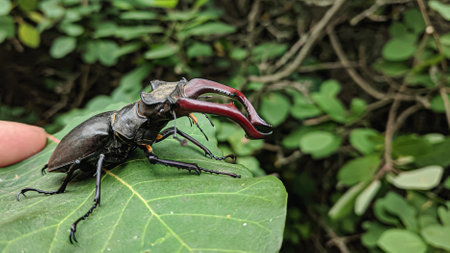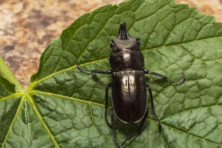 Stag beetle (Lucanus cervus) on a green leaf