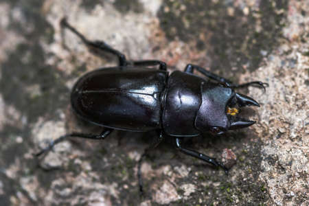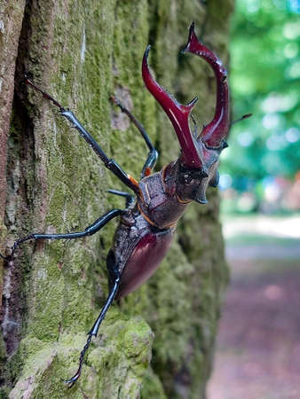 Male stag beetle with long and sharp jaws in wild forest sitting on the trunk of an oak tree. Beetle stag consists of big horns, beautiful strong legs. Stag beetle ready to attack for your life.