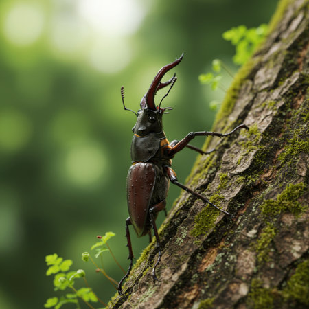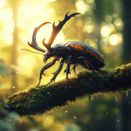 A regal stag beetle is perched on a moss-covered branch in a sunlit forest. The beetle's detailed exoskeleton shines brightly, highlighting its vivid colors against the natural background.