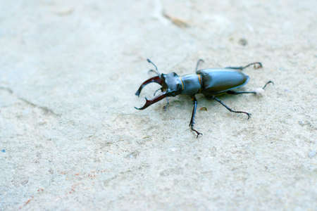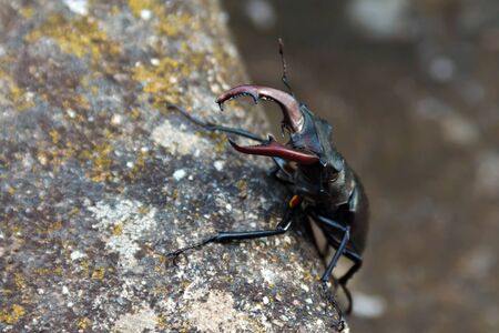 stag beetle with large antlers crawls on a stone of regular shape on a summer day