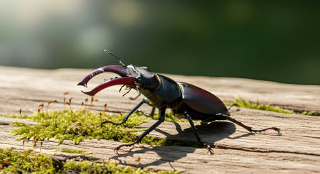 Stag beetle with antlers in the forest. Wildlife scene.