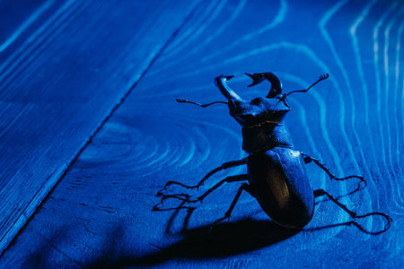 Beautiful insect listed in Red List, largest rare male stag in europe - Lucanus cervus. Horned beetle deer on blue wooden table. Wildlife. Close up.