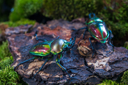 Male and female beetle stag. Rainbow stag beetle. Phalacrognathus muelleri, Mueller's stag beetle. Collect Area in Australia.