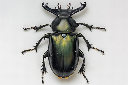 Black beetle on a white background. The beetle is a rhinoceros beetle.