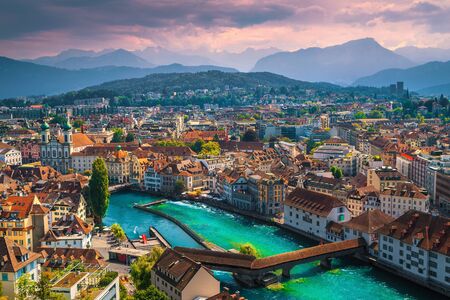 Picturesque panorama of Lucerne from the fortress tower with famous Chapel bridge on the Reuss river at sunset, Luzern, Switzerland, Europe