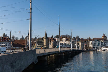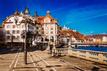 Lucerne, Switzerland, March 10, 2022 Beautiful promenade with historic buildings at the lake of Lucerne on a sunny day