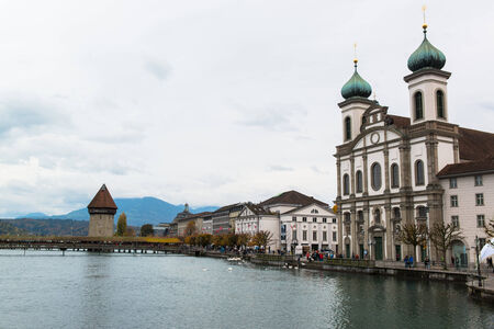 Famous Chapel bridge, Water Tower and Jesuitenkirche in historic center of Lucerne, Switzerland.