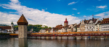 Panoramic view of the famous Chapel Bridge in Lucerne, Switzerland