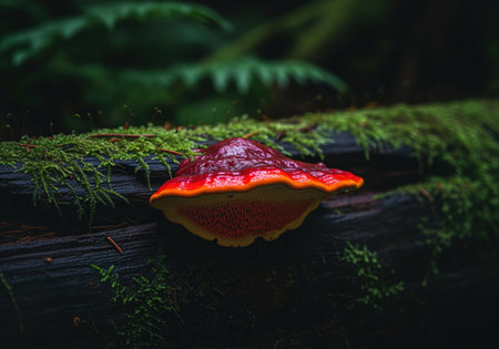 Striking crimson and orange bracket fungus attached to a dark, moss covered log deep within a damp forest. perfect for themes of nature, decay, and mycology.