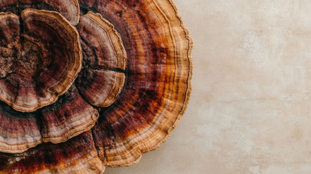 Captivating top view of a large reishi mushroom displaying intricate patterns and vibrant colors against a neutral backdrop, perfect for nature-themed designs.