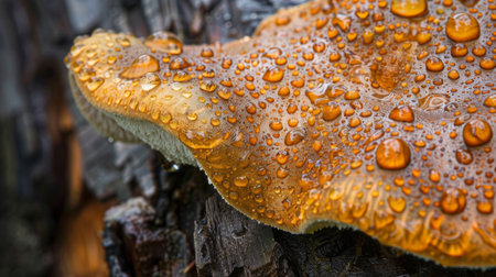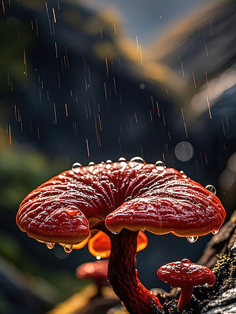 Isolated Reishi mushroom growing from tree bark with morning dew and natural light