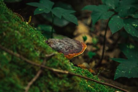 Close up of a tree with old bark and moss and special tree mushroom in green nature