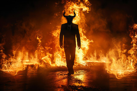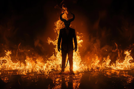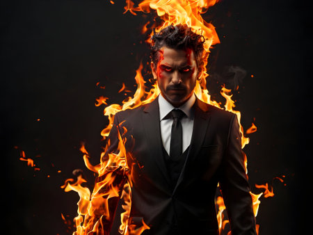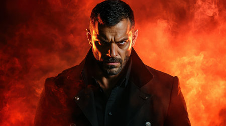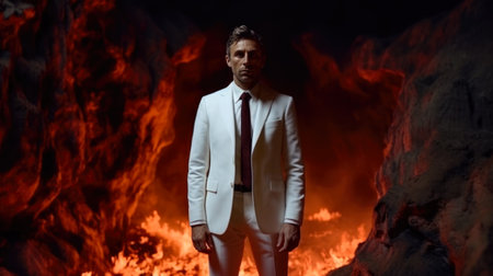 a devil man, dressed in a suit, stands amidst a fiery backdrop, exuding a mysterious aura. this uhd image captures the essence of darkness and intensity, with multiple filter effects enhancing the overall impact. the subject's strong facial expression adds to the demonic vibe, creating a captivating photograph reminiscent of toby fox's contrasting values. ai generated