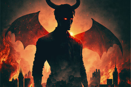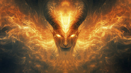 the demon, engulfed in flames, stands tall in the depths of hell, its full body a testament to its malevolent power, with razor-sharp horns, glowing red eyes, and massive wings spread wide, exuding an aura of terror and darkness in this eerie underworld scene. ai generated